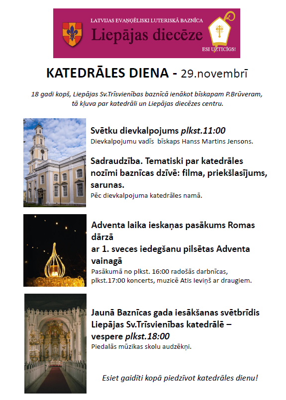 30. novembrī/ Adventa pirmā svētdiena – kopā ar LELB draudzēm lūgsim par mācītāju Juri Veidenieku un draudzēm, kurās viņš kalpo – Rojas, Dārtes un Kaltenes draudzēm.