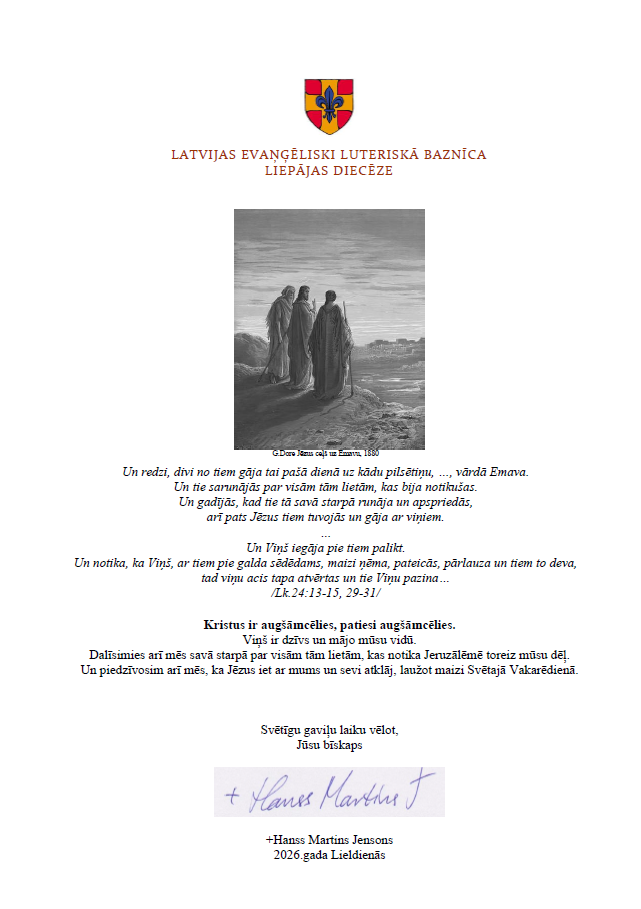 12. aprīlī / Baltajā svētdienā – kopā ar Liepājas diecēzes draudzēm lūgsim par dekānu Pēteri Kalku un draudzēm, kurās viņš kalpo – Liepājas Svētās Trīsvienības, un Krūtes – Bārtas draudzēm.